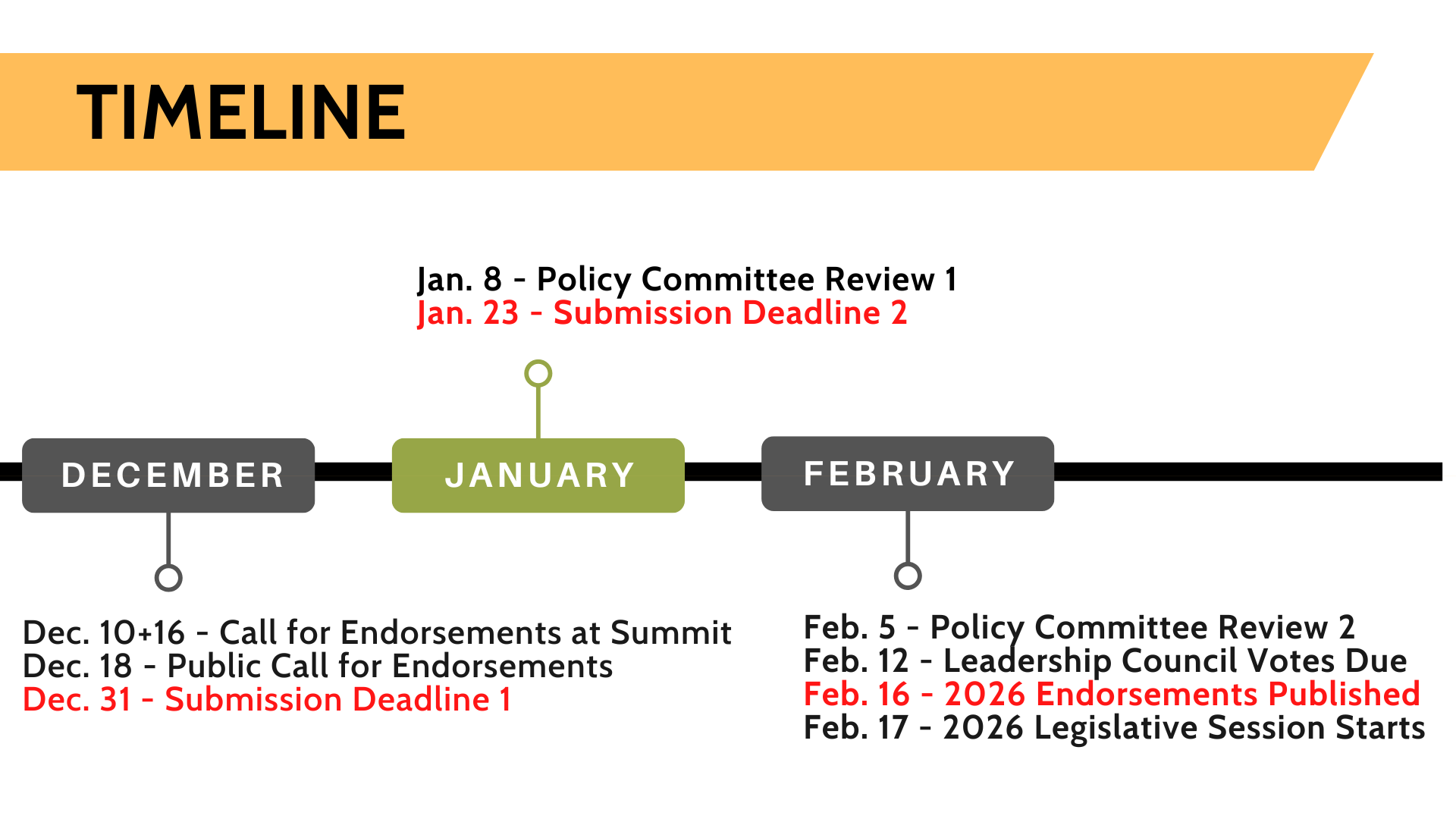 The contacts who submit proposals will then be notified and our policy endorsements will be posted on this page. The Executive Director will work with submitters on required next steps, materials and action steps to fulfil the approved endorsements of the Leadership Council.